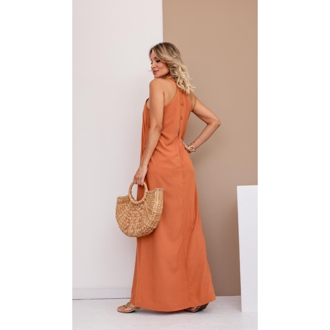Os bolsos laterais funcionais adicionam praticidade sem abrir mão do charme, enquanto os botões nas costas e as alças finas com regulagem garantem um ajuste perfeito e um toque delicado ao visual.