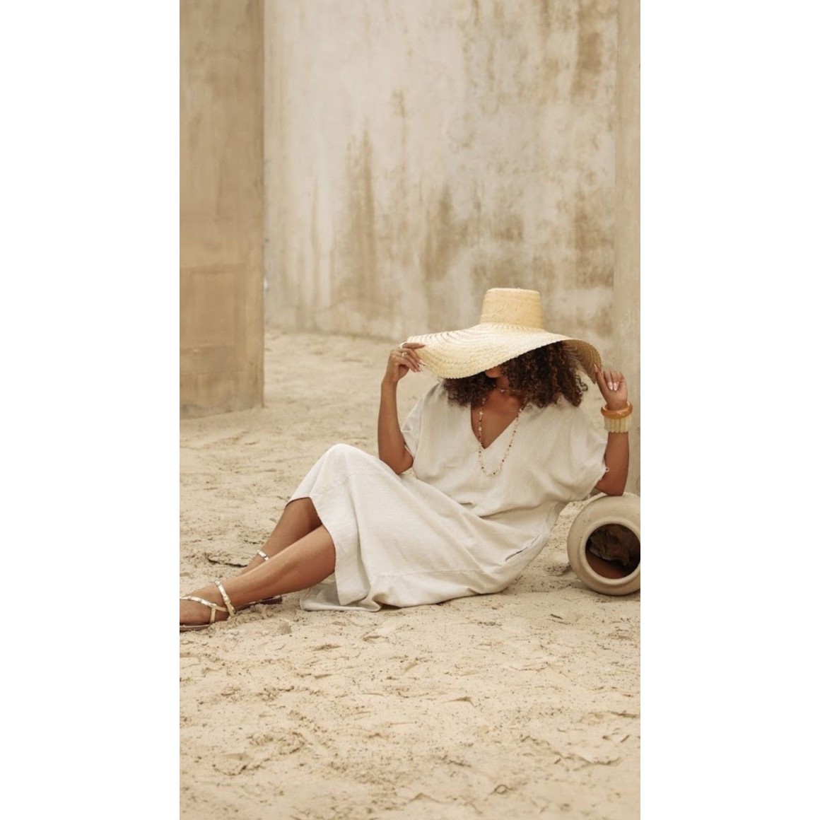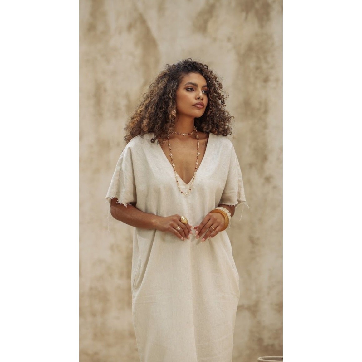 O vestido mullet oversized é confeccionado em tecido de 80% linho e 20% algodão, garantindo leveza, frescor e caimento natural. Seu decote em V valoriza o colo de forma elegante, enquanto os detalhes em corte a fio trazem um toque fashion e despojado.
