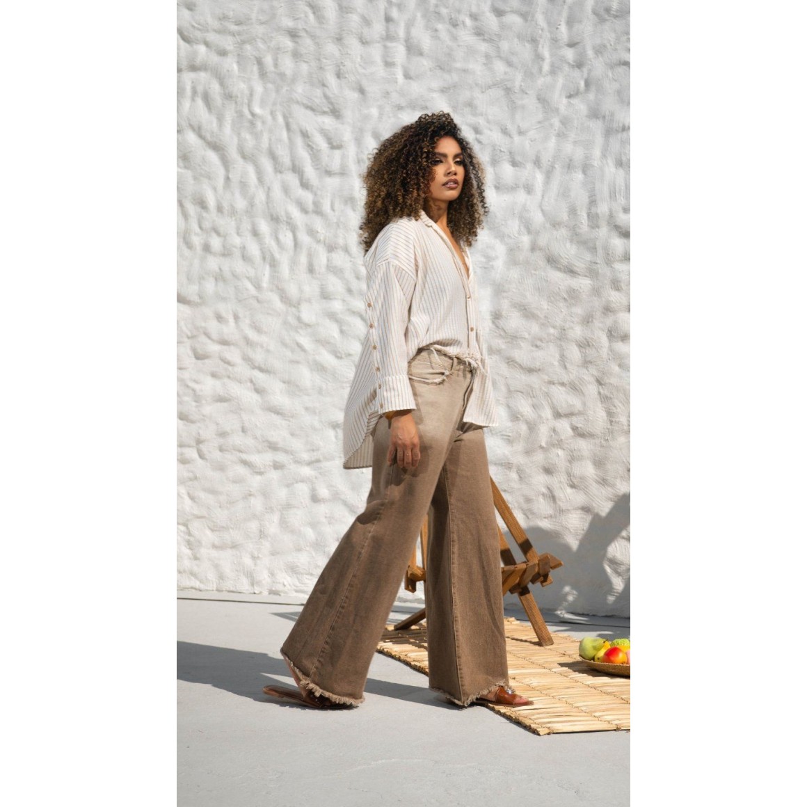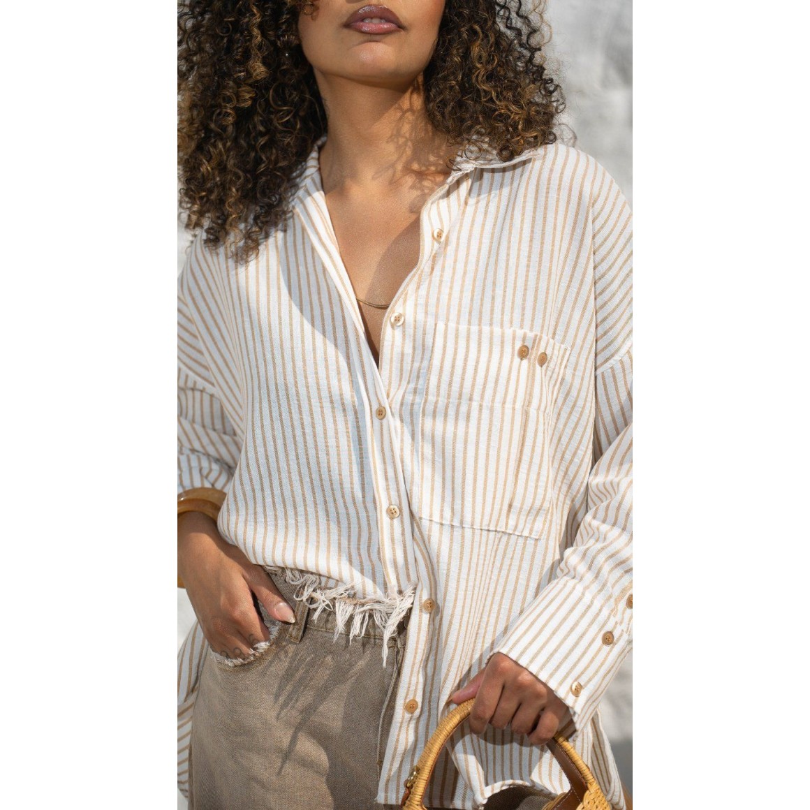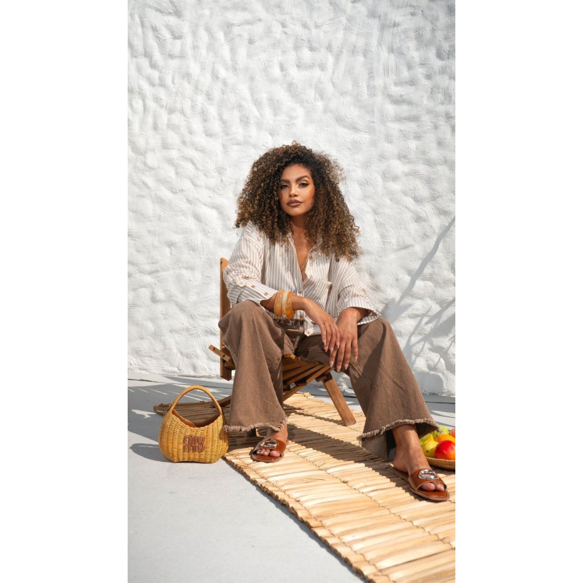 A camisa listrada oversized é a peça-chave da temporada, trazendo o equilíbrio ideal entre estilo, conforto e versatilidade. Confeccionada em 70% poliéster e 30% linho, tem caimento impecável, textura leve e toque sofisticado.