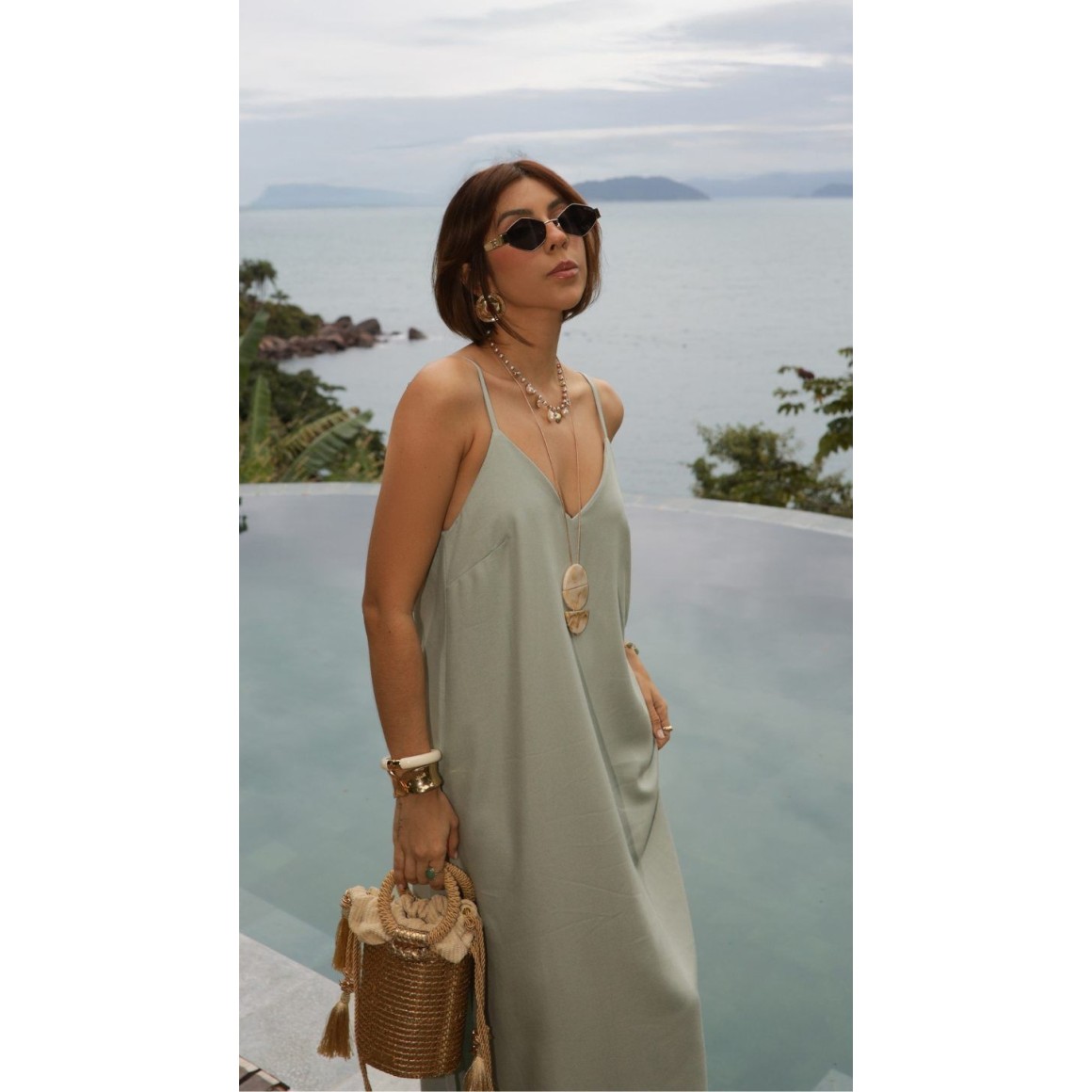 Com decote V na frente e nas costas, o modelo valoriza a silhueta de forma delicada e moderna. As fendas laterais garantem movimento e conforto, tornando a peça ideal para dias quentes ou composições leves e elegantes.