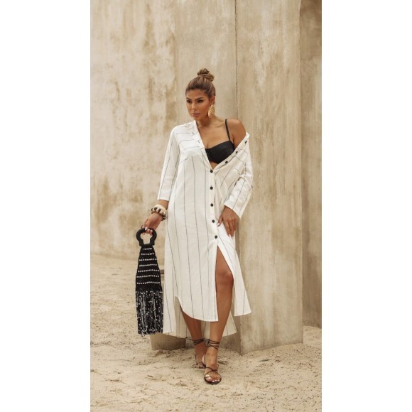 Com corte versátil e alongado, pode ser usada como vestido, sobreposição ou saída, adaptando-se facilmente a diferentes estilos. A gola de camisa italiana traz um toque refinado, enquanto os botões frontais e o martingale nas mangas 3/4 permitem ajustar o visual de maneira prática e elegante. As fendas laterais completam o design, oferecendo movimento e conforto com um toque fashion.
