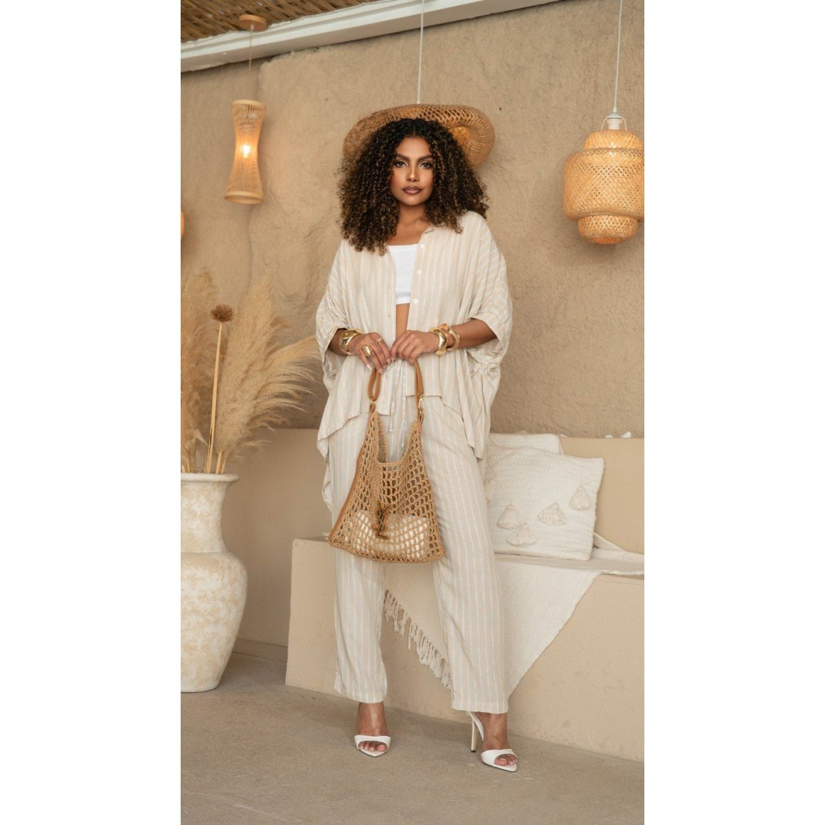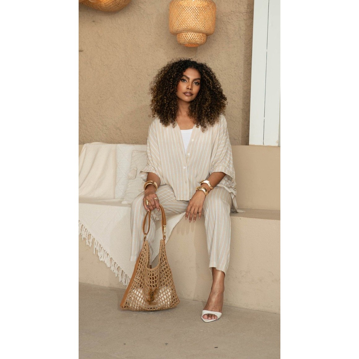O conjunto listrado é composto por duas peças versáteis e sofisticadas, perfeitas para quem busca elegância e praticidade no dia a dia. Confeccionado em 100% viscose, o tecido leve e fluido proporciona ótimo caimento, movimento natural e conforto absoluto.