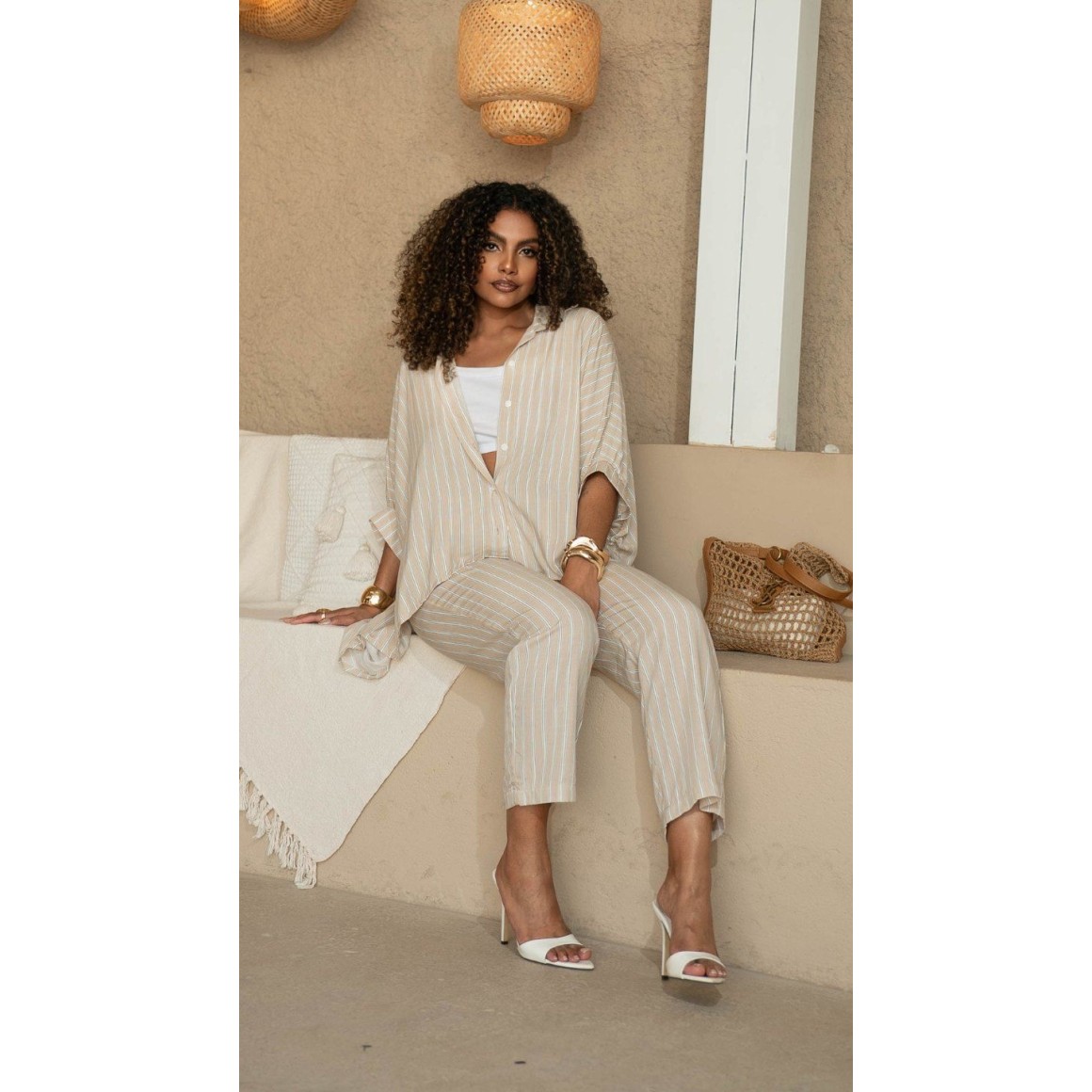Conjunto Listrado em Viscose com Camisa Oversized e Calça Reta
