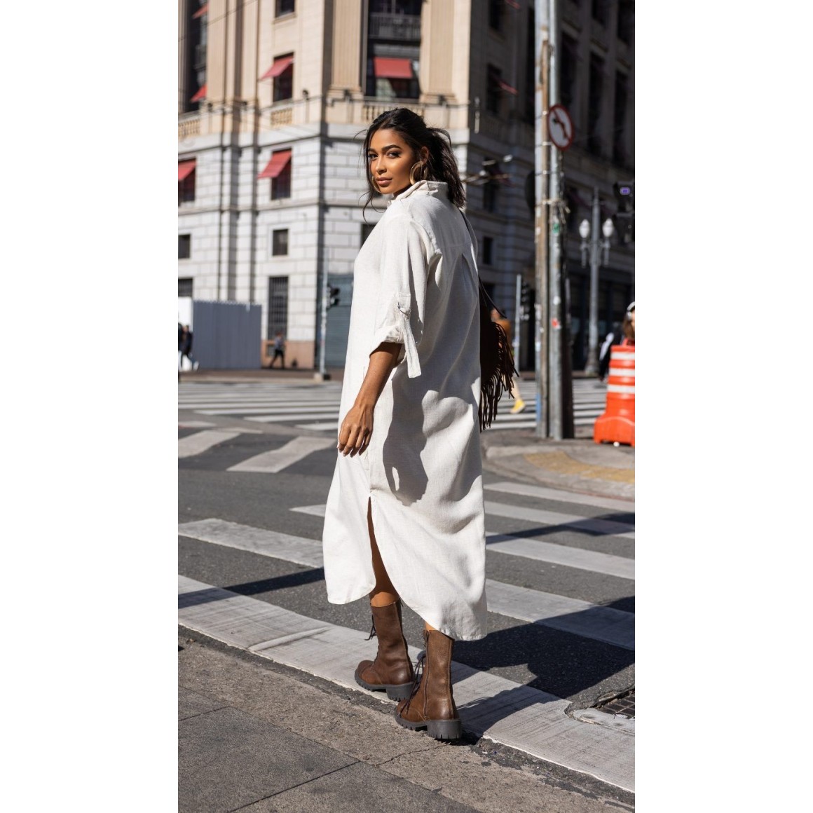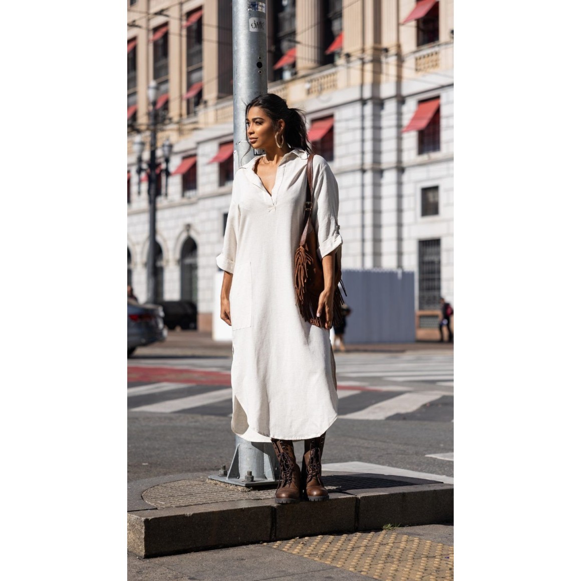 O chemise com gola camisa e decote em V é a escolha ideal para quem busca praticidade sem abrir mão do estilo. Com manga 3/4, bolsos funcionais e barra em corte mullet com fenda, a peça traz movimento e um caimento impecável, perfeito para diferentes ocasiões do dia.
